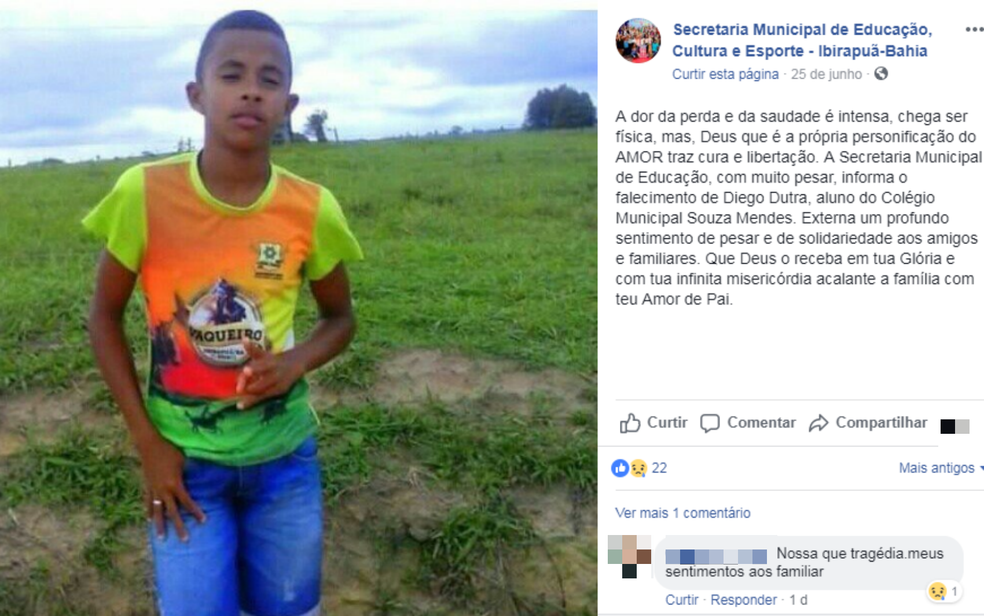 “A dor da perda e da saudade é intensa, chega ser física, mas, Deus que é a própria personificação do AMOR traz cura e libertação. A Secretaria Municipal de Educação, com muito pesar, informa o falecimento de Diego Dutra, aluno do Colégio Municipal Souza Mendes. Externa um profundo sentimento de pesar e de solidariedade aos amigos e familiares. Que Deus o receba em tua Glória e com tua infinita misericórdia acalante a família com teu Amor de Pai”. Fonte: G1